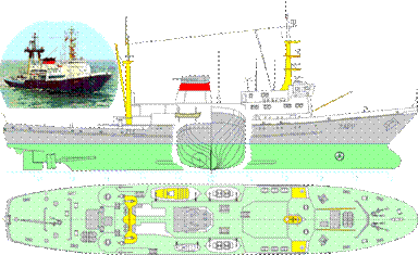 Рис.39. Океанский спасатель. На основе исторического анализа эти корабли можно сопоставить с поморскими кочами и ладьями викингов, если, конечно, исключить соотношение размеров корпуса и его относительную прочность. Такие обводы оправданы только для малых судов, способных удерживаться на поверхности волны, несмотря на огромные ускорения в процессе качки (теоретически - это g, если на вершине волны имеется обрушающийся гребень), и перед которыми не ставится задача сохранения хода, работоспособности оборудования, комфортной обитаемости и т.п. Остается надежда, что такая форма корпуса всего лишь вершина абсурдов борьбы с заливаемостью верхних палуб
