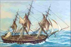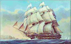 Рис.20. Фрегат «Паллада» (рисунок Е. Войшвилло). Многочисленное парусное вооружение красавца фрегата XIX века позволяет поддерживать хороший ход на умеренных и сильных ветрах. Спрямленная палуба корабля свидетельствует о том, что совершенство техники управления парусами позволяет сохранять ходкость и управляемость корабля даже под воздействием ураганных штормов.