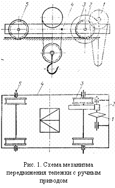 Механизмы передвижения с ручным приводом. Ручной привод применяется на кранах, используемых на складах и производственных участках с ограниченным объемом работы. Обычно грузоподъемность таких кранов не выше 15—20 Т, пролет не более 14—17 м. Мостовые краны с ручным приводом в зависимости от грузоподъемности и величины пролета могут иметь однобалочную конструкцию моста из двутаврового профиля, по полкам которого передвигается каретка (кошка) с подвешенным к ней подъемным устройством, или мост двухбалочной конструкции с четырехтактовой тележкой (рис. 1). Механизм передвижения тележки смонтирован на раме 4, опирающейся на два ведущих (приводных) 3 и два ведомых (неприводных) 5 колеса. Ведущие колеса приводятся во вращение через зубчатую передачу 2 с тягового колеса 1 с тяговой цепью или с помощью рукоятки.