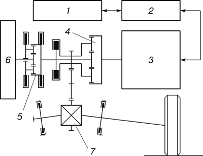 Рисунок 1.1. Схема гибридного силового агрегата с маховичным накопителем и электромеханическим приводом фирмы "BMW" (Германия): 1 – источник тока; 2 – система управления; 3 – обратимая электромашина; 4 – дифференциальный механизм; 5 – мультипликатор; 6 – маховичный накопитель; 7 – главная передача