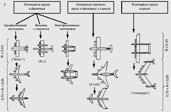 Еще большее разнообразие схемно-компоновочных решений характерно для разрабатываемых в течение последних десятилетий проектов сверхтяжелых грузовых самолетов, предназначенных для решения проблем возрастания грузоперевозок особенно в условиях энергетического и прочих кризисов. При этом важное значение имеет разработка классификации схем и компоновок гигантских самолетов, которые способствуют систематизации рассматриваемых тенденций. Успех любой классификации зависит от того, действительно ли важнейший признак или критерий выбран из всего многообразия и положен в ее основу. Анализ результатов применения классификации по аэродинамическим схемам к сверхтяжелым самолетам показал узость, ограниченность ее использования для оценки принципиальных, качественных отличий, характеризующих отдельные конструктивно-компоновочные решения. В этих проектах наглядно прослеживается отмеченная тенденция ко все большему размещению грузов в крыле. Однако, на практике эту тенденцию нельзя обнаружить с помощью классификации по аэродинамическим схемам, т.к. варианты размещения всех грузов не только в фюзеляже, но и смешанное их расположение в фюзеляже и крыле (и даже полное их размещение в крыле) могут быть реализованы в любой из трех известных аэродинамических схем. Например, проект самолета фирмы Локхид с распределенной по размаху крыла полезной нагрузкой (схема "Спенлоудер"), который имеет все весовые и конструктивно-компоновочные отличия, присущие схеме "летающее крыло"; однако, добавление установленных на концах крыла консолей горизонтального оперения заставляет отнести этот самолет к обычной аэродинамической схеме с хвостовым оперением, а не к "летающему крылу". Поэтому целесообразно классифицировать сверхтяжелые транспортные и грузовые самолеты не по аэродинамическим схемам, а по главнейшим их отличительным признакам, связанным с местом размещения их полезной нагрузки. Именно такая классификация этих самолетов позволяет выявить основные отличия в схемно-компоновочных решениях, влияющих на их весовые, аэродинамические, эксплуатационные характеристики, а следовательно, и на показатели их экономической эффективности.