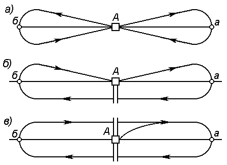 Рисунок 1. Способы обслуживания поездов локомотивами: а) – плечевой; б) – петлевой; в) – кольцевой; А – основное депо; а, б – оборотное депо.