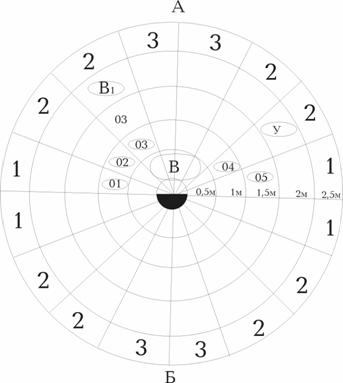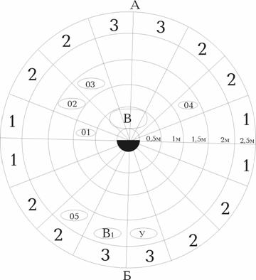 Решение задачи нахождения оптимального варианта организации рабочих мест может быть значительно упрощено с помощью специальных систем бальной оценки различных вариантов. Сущность методики заключается в том, что любое рабочее место схематично можно разделить на ряд зон в зависимости от состава трудовых движений, необходимых для перемещения предмета труда к месту его установки, перестановки, обработки. При построении данной схемы рабочее место в плане разделено на две основные зоны: А, находящуюся спереди от основной линии, и Б, находящуюся сзади этой линии. Каждая из основных зон разделена на ряд секторов в зависимости от расположения к рабочему, а каждый сектор, в свою очередь разделен концентрическими окружностями, определяющими расстояние места расположения предметов труда от рабочего (в м.). Зоны делятся также в зависимости от расположения предмета по высоте на верхние (В) и нижние (Н). Цифровая индексация построена таким образом, что меньшее значение индексов соответствует более удобным зонам.
