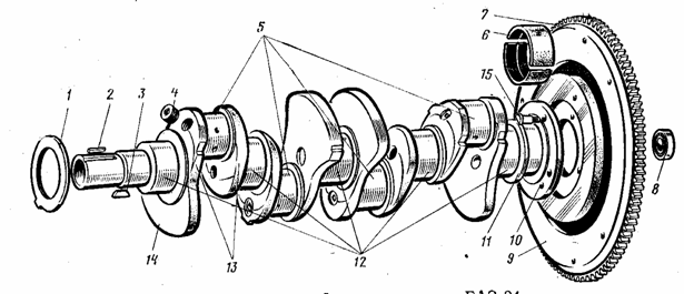 Коленчатый вал состоит из коренных (опорных) шеек 12, шатунных шеек 5, содиненных между собой щетками 13. На некоторых из них имеются противовесы 14. Передняя часть вала называется носком, задняя - хвостовиком. На носке вала на шпонке 3 устанавливается газораспределительная шестерня, на шпонке 2 - шкив привода генератора, вентилятора и других вспомогательных агрегатов двигателя. В торце носка вала нарезано резьбовое отверстие для храповика, при помощи которого вал можно провернуть от руки пусковой рукояткой. К фланцу 10 хвостовика болтами 15 крепится маховик 9, на который напресован стальной зубчатый венец 7 для пуска двигателя стартером. Маховик предназначен для вывода поршней из мертвых точек и обеспечения равномерного вращения коленчатого вала. Масса маховика способствует плавному троганию автомобиля с места и облегчает пуск двигателя. На хвостовике имеется маслосбрасывающий гребень 11; в хвостовике вала расположено отверстие для подшипника 8 переднего конца ведущего коробки передач. Масло к шатунным подшипникам поступает от коренных шеек по отверстиям, имеющимся в теле коленчатого вала. Шатунные и коренные шейки выполнены полыми. Шатунные шейки имеют грязеуловительные полости, которые закрываются пробками 4. Передний и задний концы валов, выступающие из блока двигателя, уплотняются сальниками. [4, c. 65-66]