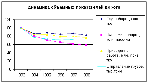 В последние годы на дороге происходит падение объемов работы, о чем говорят данные табл.2.2. Падение же объемов работы приводит к увеличению себестоимости транспортной продукции, что находит отражение в увеличении тарифов. А это в свою очередь стимулирует дальнейшее сокращение перевозок.