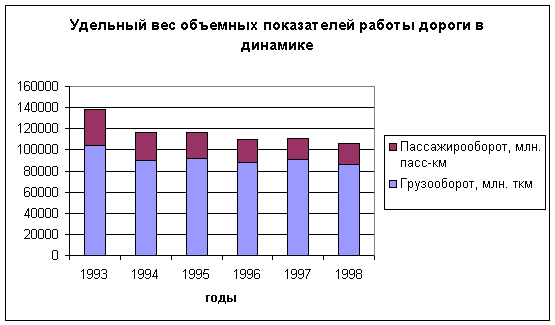В свою очередь наблюдается падение пассажирооборота более быстрыми темпами, чем грузооборота. Это влияет на структуру приведенной работы. Происходящее изменение в структуре приведенной работы имеет для дороги большое экономическое значение. Дело в том, что грузовые перевозки на сегодняшний день достаточно рентабельны, а доходы от пассажирских перевозок не покрывают связанные с ними расходы. Таким образом, снижение доли пассажирских перевозок в общем объеме работы, способствует улучшению финансового положения дороги.