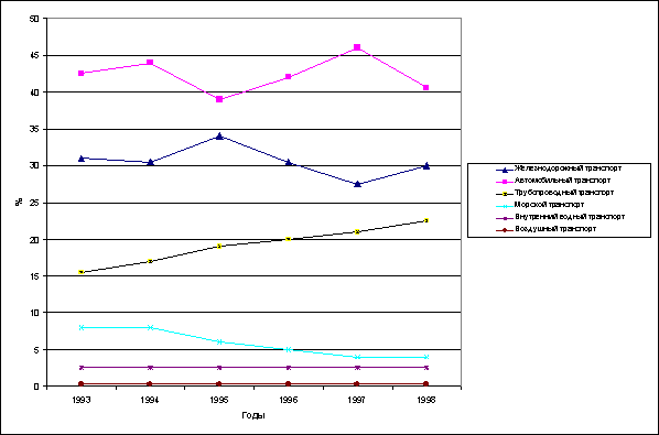 Рис.1 Динамика структуры транспортного рынка России в грузовом сообщении