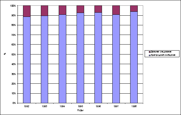 Рис.2 Динамика структуры пассажирских перевозок по видам сообщения на N-ской железной дороге