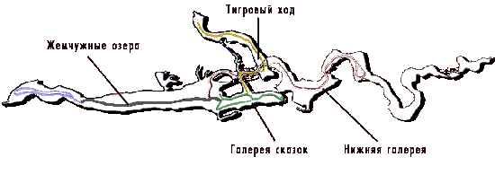 В старой части нижней пещеры, в 180 м от входа, в конце Грибоедовского коридора (назван в честь А.С. Грибоедова, побывавшего здесь в 1825 г.), давно были известны небольшие подземные озеро и река. Во вновь открытых галереях и залах обводненные полости тянутся на сотни метров; площадь некоторых озер достигает 500 м2 при глубине 3 м и более. Запасы подземных вод в пещере в зависимости от времени года колеблются от 15 тыс. м3 до 250 тыс. м3.