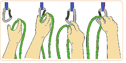 Для вщелкивания веревки в карабин рекомендуется следующий прием. Веревку вытягивают вверх (при этом ее придерживают, зажимая в зубах — это не очень удобно, да и небезопасно для зубов, но ничего лучшего не придумано). Если можно не зажимать в зубах — лучше не зажимать. Потом веревку перехватывают рукой и приемом, указанным на рисунке, вщелкивают ее в карабин.