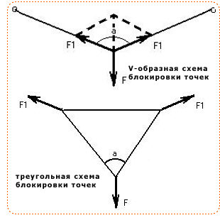 На веревку действует сила F1, растягивающая ее. При этом силы F1 по разную сторону веревки равны по величине, но имеют разное направление. Векторно складываясь, она образует силу, которая равна силе F по величине и противоположна по направлению. Нетрудно определить, что F1=F/(2·cosa/2), где а — угол между веревками в точке приложения силы F. При F1=F/2, при а=180° значение силы бесконечно велико. Чем угол ближе к 180°, тем больше будет сила растяжения веревки.По этой причин при организации перил чрез различные препятствия (реки, трещины) невозможно, чтобы веревка не имела провиса, как бы ее не натягивали. Чем меньше провис, тем большая сила будет действовать на точки закрепления веревки. Это же надо иметь в виду при блокировании точек страховки — угол между ними нельзя делать, как мы увидим, больше 120°. Приведем еще формулу для варианта блокирования точек треугольной схемой. При этом, как видно из таблицы ниже, угол а не должен быть больше 60°. F1=F/(2·sin(π/-a/4)). Из таблицы видно, что при угле 120° для V-образного блокирования нагрузка на каждую точку страховки составляет 100% от приложенной силы и фактически эффект блокирования теряется (то есть две точки работают с той же надежностью, что и одна). Для треугольной схемы величина угла, при котором уже не имеет смысла блокировать точки, составляет 60°. Величина нагрузки на точки страховки в зависимости от угла блокирования точек страховки