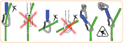 Как правильно пользоваться карабинами и оттяжками на промежуточных точках? У карабинов без муфты есть опасная особенность — веревка может самопроизвольно выщелкнуться из карабина, карабин может даже самопроизвольно выщелкнуться из анкера. Поэтому надо быть очень внимательным при работе с карабинами и оттяжками. Веревка должна вщелкиваться в карабин так, чтобы она шла снизу-вверх, как показано на рисунке. Веревка не должна прижимать муфту карабина. Это может привести к выщелкиванию веревки из карабина. То есть основной критерий правильного вщелкивания веревки в промежуточную точку тот, что при движении через него веревка должна приподнимать карабин, а не прижимать его к скале (или другому рельефу). На рисунках показаны характерные ошибки работы с карабинами на промежуточных точках.