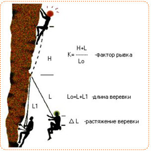 P — вес человека (P=mg) H — превышение человека над последней точкой страховки L — длина свободной веревки ΔL — длина, на которую веревка максимально растянулась