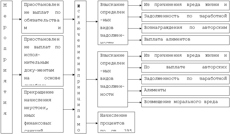 Внешнее управление может быть введено только арбитражным судом, который либо утверждает соответствующее решение собрания кредиторов, либо действует по собственной инициативе. Введение внешнего управления влечет отмену принятых в течение периода наблюдения мер, обеспечивающих сохранность имущества должника. Очень важная мера, которая служит обеспечению возможности проведения внешнего управления – мораторий на удовлетворение кредиторов, возникших до его введения. Предполагается продолжение функционирования предприятия-должника в течение периода внешнего управления, поэтому необходима отсрочка платежей. Назначение моратория препятствует кредиторам требовать наложения взыскания на имущество должника, поскольку такие требования в ряде случаев могут обернуться его гибелью. Мораторий распространяется как на требования кредиторов, так и на требования по обязательным платежам. С момента введения внешнего управления приостанавливается начисление неустоек, финансовых санкций. (рис. 5)