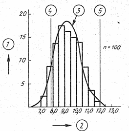 /—частота; 2—толщина пластины, мм; 3— кривая распределения частоты; 4—нижнее предельное значение нормы; 5— верхнее предельное значение нормы (верхняя граница нормы)