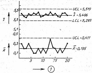 Поскольку в рассматриваемом примере количество выборок n==5, коэффициенты Аз, D4 и D3 берут соответствующими количеству выборок n=5, т. е. А2=0,577;D4=2,115; Dз= — (не предусмотрено). Расчет дает следующие значения для контрольных границ: