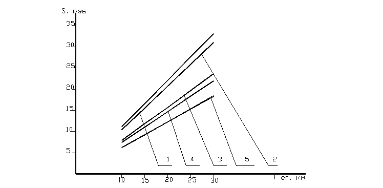 Для на­глядности представления результатов расчетов строим график зависимости себестоимости от расстояния перевозки (рис. 5).