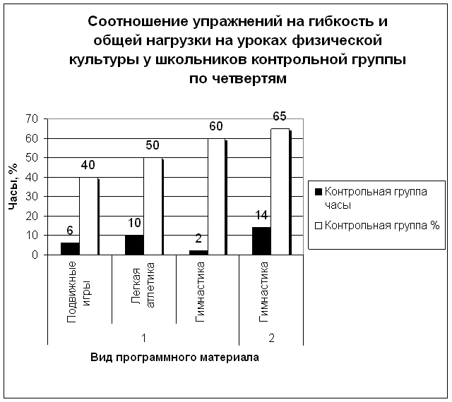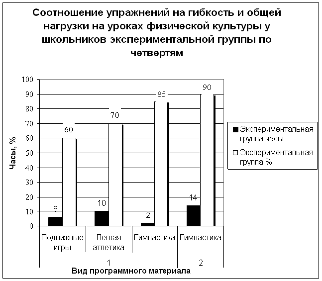 Таблица 9. Соотношение упражнений на гибкость и общей нагрузки на уроках физической культуры у школьников контрольной и экспериментальной групп по четвертям.