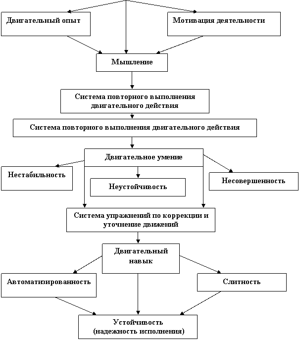 Таким образом, двигательный навык - это оптимальная степень владения техникой действия, характеризующаяся автоматизированным (т.е. при минимальном контроле со стороны сознания) управлением движениями, высокой прочностью и надежностью исполнения.