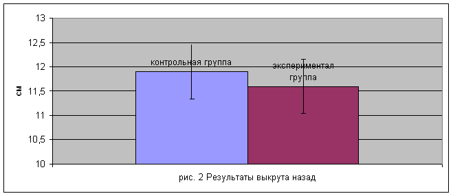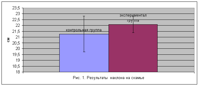 Гибкость – неотъемлемое и важное физическое качество в художественной гимнастике. Результаты теста «наклон на скамье» показывают, что уровень гибкости позвоночного столба у гимнасток экспериментальной и контрольной групп не имеет достоверного отличия (рис 1).
