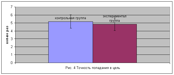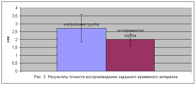 Немаловажное значение для художественной гимнастики имеют координационные способности. Нами были выбраны тесты, отличающиеся простотой проведения. Так, для определения дифференцировочной способности юных гимнасток мы использовали тест на точность воспроизведения заданного временного интервала (рис 3). Результаты показывают отсутствие достоверного различия между группами. Однако гимнастки контрольной группы, в среднем хуже справились с заданием и определяли время менее точно.