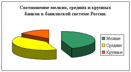 По состоянию на 1 июля 1998 г. в стране действовало 1519 кредитных организаций, имеющих право на осуществление банковских операций. Примечательно, что банковская система России в основном представлена небольшими банками с уставным фондом до 5,5 млн. руб. (45%), и средними банками с уставным фондом от 5,5 млн. до 20 млн. руб. (40%). Правда, крупные банки с уставным фондом более 20 млн. руб. (15%) растут более высокими темпами.[13]