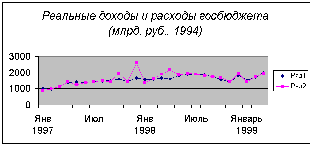 На рис. 3 показаны реальные доходы и расходы государственного бюджета, скорректированные на уровень инфляции.Рис.31