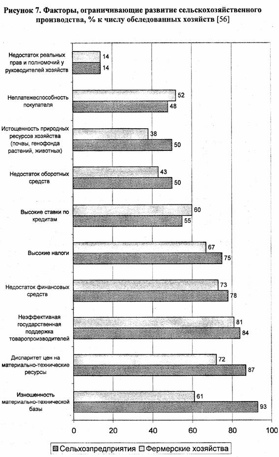 На рис. 7 приведены главные факторы, ограничивающие развитие сельского хозяйства (по данным опросов Госкомстата).