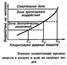 Степень вредного воздействия загрязнений зависит от их химического состава, концентрации в воздухе, воде, пище, продолжительности действия, степени аккумуляции их органами человека. Наибольшую опасность представляют вещества, оказывающие влияние на органы человека и кровь. Химические соединения и синтетические вещества вызывают отравления. До концентрации С1 химические загрязнения не оказывают влияния на здоровье человека. В диапазоне концентраций С2—С3 загрязнения при попадании в организм человека и длительном действии могут вызывать хронические заболевания. При концентрации выше С2 могут произойти острые отравления, а более С3 — наступить смерть.