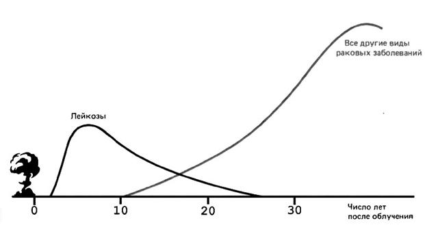 Еще одним тяжелым последствием облучения является рак. Рак - наиболее серьезное из всех последствий облучения человека при малых дозах, по крайней мере, непосредственно для тех людей, которые подверглись облучению. В самом деле, обширные обследования, охватившие около 100000 человек, переживших атомные бомбардировки Хиросимы и Нагасаки в 1945 году, показали, что пока рак является единственной причиной повышенной смертности в этой группе населения.