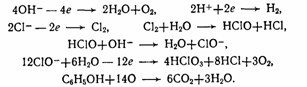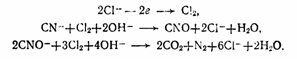 Разрушение цианидов происходит в результате электрохимического окисления на аноде и окисления хлором, выделяющимся на аноде в результате разложения NaCl. Этот процесс описывается следующими реакциями: