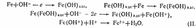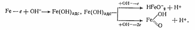 На первой ступени, включающей адсорбцию гидроксида на железном электроде и потерю первого электрона, образуется промежуточное кислородсодержащее соединение одновалентного железа. На второй стадии реакция протекает по двум возможным направлениям и завершается образованием двух- или трехвалентного железа. Общая скорость процесса анодного растворения лимитируется второй стадией.