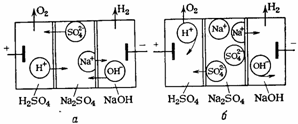 Рис. 6. Схемы электродиализаторов с пористыми диафрагмами (а) и иони-товыми мембранами (б)