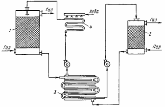Абсорбционные методы служат для технологической и санитарной очистки газов. Они основаны на избирательной растворимости газо- и парообразных примесей в жидкости (физическая абсорбция) или на избирательном извлечении примесей химическими реакциями с активным компонентом поглотителя (хемосорбция). Абсорбционная очистка –непрерывный и, как правило, циклический процесс, так как поглощение примесей обычно сопровождается регенерацией поглотительного раствора и его возвращением в начале цикла очистки. При физической абсорбции (и в некоторых хемосорбционных процессах) регенерацию абсорбента проводят нагреванием и снижением давления, в результате чего происходит десорбция поглощенной газовой примеси и ее концентрированно (рис.4).