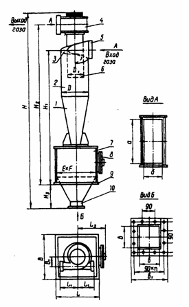 1 - коническая часть циклона; 2 - цилиндрическая часть циклона; 3 - винтообразная крышка; 4 - камера очищенного газа; 5 - патрубок входа запыленного газа; 6 - выхлопная труба; 7 -бункер; 8 - люк; 9 - опорный пояс; 10 - пылевыпускное отверстие.