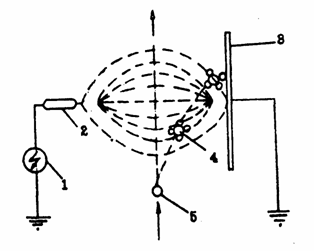 1 - источник электропитания; 2 - коронирующий электрод; 3 - осадительный электрод; 4 -ион газа; 5- частица пыли.