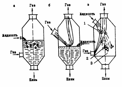 Необходимо стремиться к созданию мокрых промывателей с минимальным гидравлическим сопротивлением, работоспособных при низких расходах воды. Эффективность очистки пыли зависит от размеров улавливаемых частиц и от других свойств пыли. Необходимость концентрирования системы жидкость - твердое тело с возвратом очищенной воды на пылеулавливание, накопление в орошаемой жидкости растворимых компонентов пыли усложняет систему мокрого пылеулавливания. В общем виде процесс улавливания пыли мокрым методом представляется как перенос твердой фазы из газовой среды в жидкую и удаление последней из аппарата вместе с твердой фазой [2,3]. В зависимости от формы контактирования фаз способы мокрой пылеочистки можно разделить на: 1 - улавливание в объеме (слое) жидкости; 2 - улавливание пленками жидкости; 3 - улавливание распыленной жидкостью в объеме газа (рис. 9).