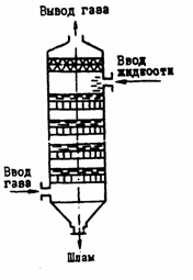 При объемно-жидкостном способе поток запыленного газа пропускают через определенный объем жидкости. Для этой цели используют пенные пылеуловители с провальными тарелками или тарельчатые скрубберы, эффективность которых может достигать 90-95%. На рис. 10 представлен тарельчатый скруббер.