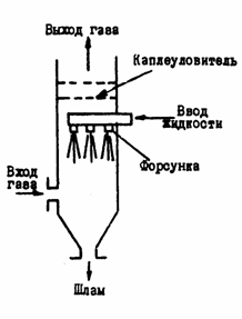 Улавливание пыли распыленной жидкостью заключается в том, что орошающая жидкость вводится в запыленный объем (поток) газа в распыленном или дисперсном виде. Распыление орошающей жидкости производится с помощью форсунок под давлением или за счет энергии самого потока газа. Первый способ распыления используется в полых скрубберах (рис. 12), второй - в турбулентных промывателях и скрубберах Вентури (рис. 13).