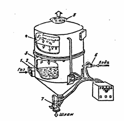 1 - входной патрубок; 2 - газораспределительная решетка; 3 - корпус; 4 -каплеотделитель; 5 - выходной патрубок; 6 - регулятор подачи воды; 7 - разгрузочное устройство.
