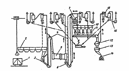 10 - бункер сырья; 11 - весы: 12 - смеситель шихты; 13 - бункер шихты; 14 - дюбель; 75 - циклон ЦН-15; 76- пылеуловитель ГДП-М.