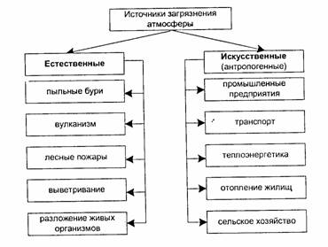 Антропогенное загрязнение спровоцировано исключительно хозяйственной деятельностью человека, его неуемным желанием создавать себе блага иногда во вред окружающей природной среде. Это загрязнение в первую очередь связано с выбросами сернистого, угарного, углекислого газов, сероводорода, оксидов и диоксидов азота, аммиака, метана (см. схему). То есть такого набора газов, которые определяли главную составляющую протоатмосферы Земли. Иными словами человек своей хозяйственной деятельностью (вопреки фотосинтезу!) возвращает систему атмосферы, в преджизненное состояние. В борьбе между фотосинтезом и загрязняющей ролью хозяйственной деятельности человека сейчас победу одерживает человек. Но эта победа — скорее признак атавизма, а не прогресса. Виды источников, нарушающих естественное состояние атмосферного воздуха, отражены на схеме.