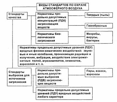 Это критерии загрязнения. Первичный стандарт, или предельно допустимая концентрация (ПДК), для каждого из них — это максимальный уровень, который человек может переносить без ущерба для здоровья, плюс 10-50% как «запас прочности». Сейчас виды. стандартов по охране атмосферного воздуха включают нормативы предельно допустимых концентраций загрязняющих веществ (взвешенные частицы, аэрозоли, пыль, газообразные компоненты); нормативы биологического загрязнения (микробы, вирусы, аллергены); нормативы предельно допустимых уровней (ПДУ) вредных физических воздействий: звуковые колебания, электромагнитное загрязнение, тепловое воздействие, проникающая радиация, вибрация и т. д. Стандарты выбросов: нормативы предельно допустимых выбросов (ПДВ) загрязняющих веществ (пары, аэрозоли).
