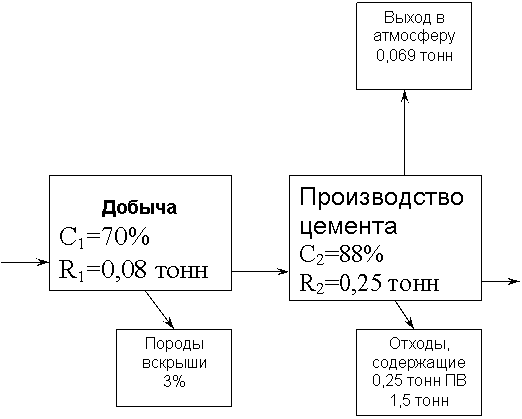 Коэффициент вскрыши равен 1,5 (на одну часть сырья приходится 1,5 пород вскрыши. Всего 2,5 части.) Содержание полезного вещества на первом звене технологической цепочке – 70%, на втором – 88%. Выброс вещества в атмосферу составит на выходе обоих звеньев 3%.