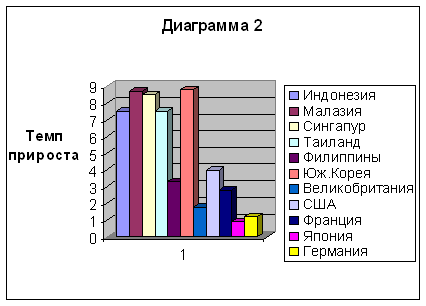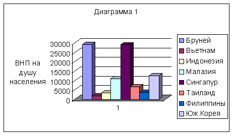 Из данной таблицы видно, что ВНП на душу населения представленной группы стран сильно варьируется (от 29000 $ в Сингапуре до 3500 $ в Индонезии и Филиппинах), что говорит о довольно значительной дифференциации государств в группе НИС по уровню экономического развития. Для большей наглядности сравнения стран представлена диаграмма (диаграмма 1).