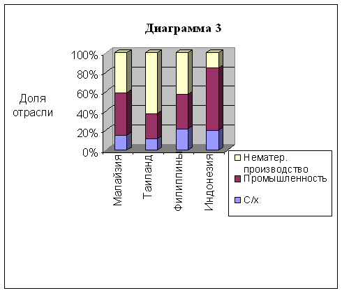 На основании приведённый данных можно сделать ряд выводов. В структуре ВВП представленной группы государств доля сельскохозяйственного комплекса по-прежнему остаётся велика (12-20% против 2-3% в развитый странах). Однако стоит отметить, что Малайзия и Индонезия добились значительных успехов в производственном секторе, что привело к увеличению доли промышленности в ВВП.