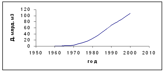 Добыча природного газа по всей развивающейся Африке (главным образом в Алжире, Египте, Ливии и Нигерии) выросла с 0,03 млрд. в 1960 г. до 26,1 млрд. м3 в 1979 г., т.е. в 870 раз. [45] В последующие два десятилетия отрасль продолжает наращивать объем добычи, так с 1980 года, когда добыча была на уровне 25 млрд. м3 , до 1999 года производство газа увеличилось более чем в 4 раза и составило 108 млрд. м3 . (рис. 4)