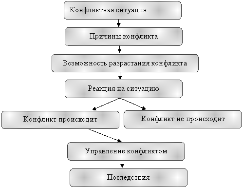 Самое распространенное определение конфликта следующее: конфликт – это отсутствие согласия между двумя или более сторонами. Одна стороны пытается навязать свои взгляды и воспрепятствовать другой стороне сделать то же самое. Каждая сторона делает все, чтобы была принята ее точка зрения, отличная от точки зрения и целей другой стороны. Зарождение и развитие конфликта можно охарактеризовать следующей схемой: