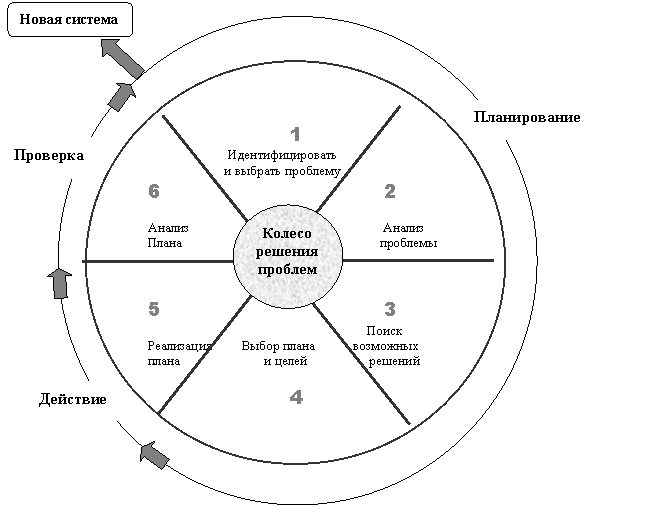 Под проблемой здесь подразумеваются самые различные аспекты: взаимоотношения, конфликт, рабочий процесс, способ изготовления деталей и т.д. Изложенная модель была придумана Шюхартом и Эдвардом Демингом, а в Марриотте на основе этого придумали «6-ступенчатое Колесо решения проблем»: