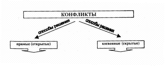 Ученые выделяют два основных типа методов решения конфликтов (рис .2): прямые (открытые) и косвенные (скрытые). Рассмотрим каждый из них.